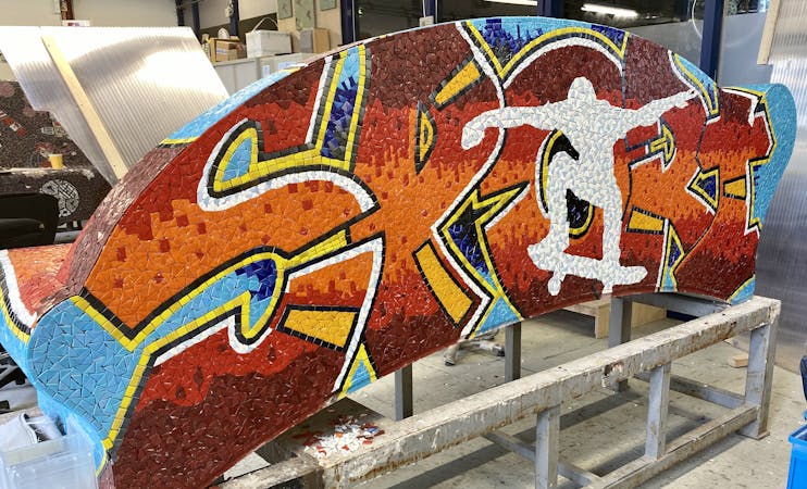 Mooie combinaties die uit onze samenwerking zijn voortgekomen, zijn de betonnen objecten met graffiti en mozaïek. Mozaïek is een klassieke, oeroude kunstvorm met wortels in de oudheid. Graffiti heeft minstens zo’n interessante historie, maar de huidige graffitistijl is pas ontstaan in de vorige eeuw.