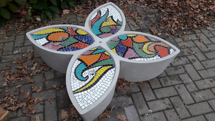 Het mozaïeken van onze betonnen bloemen is een leuke activiteit voor het afscheid van groep 8. Het is een blijvende herinnering en een mooi en duurzaam object voor op het schoolplein. Flora  kan tegen een stootje, is makkelijk te onderhouden en volledig te personaliseren. Samen met de leerlingen van groep 8 kies je een mozaiekpatroon uit. Jullie kunnen ieder bloemblad een ander patroon geven, maar het is mogelijk om op de 4 bladen 1 groot patroon te mozaïeken. Zij hebben een blijvend aandenken aan hun tijd op school, en als school hebben jullie er een plekje bij waar andere leerlingen buiten op kunnen spelen en zitten.
